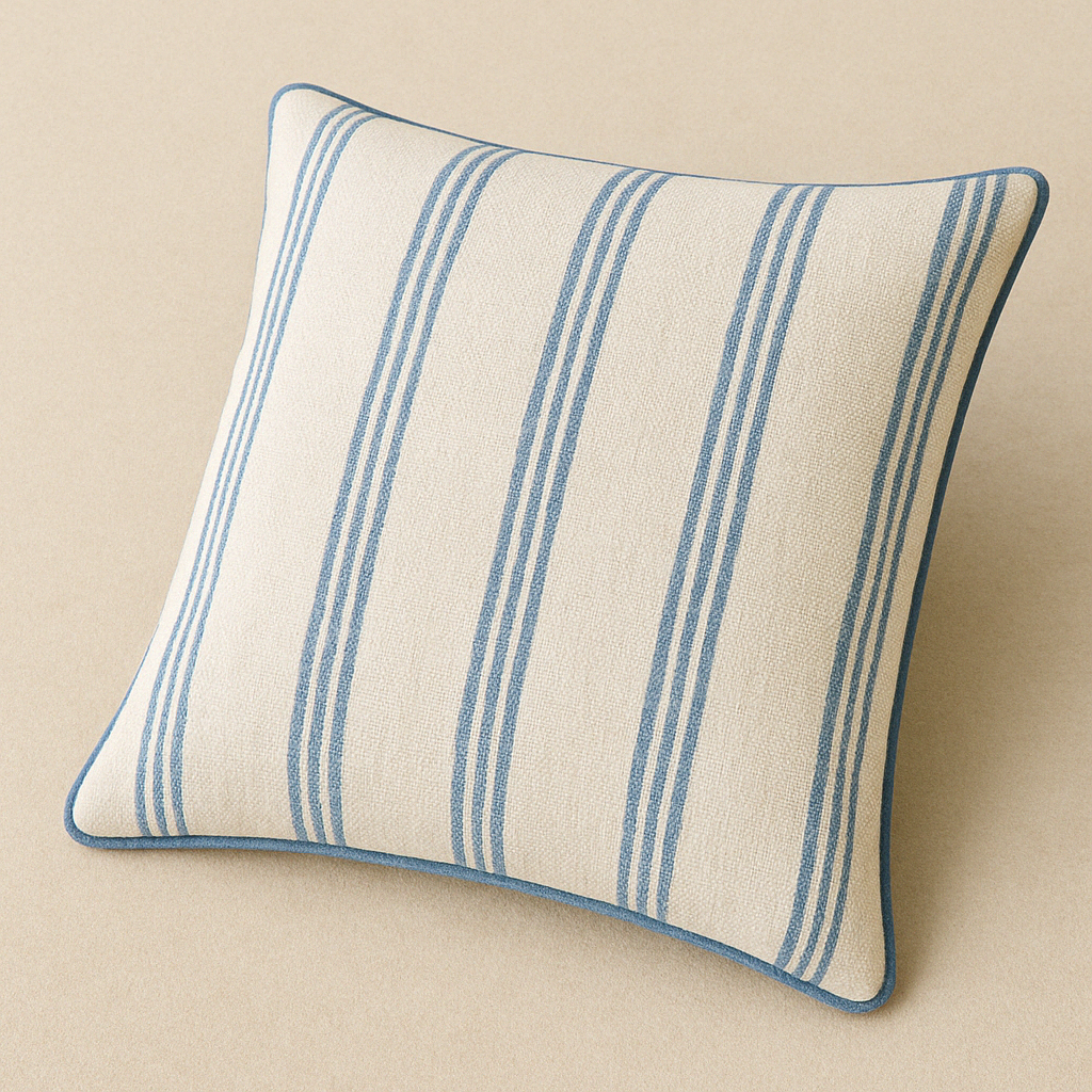 Cojín cuadrado con rayas azul claro sobre fondo crudo. Frescura mediterránea para exteriores e interiores.