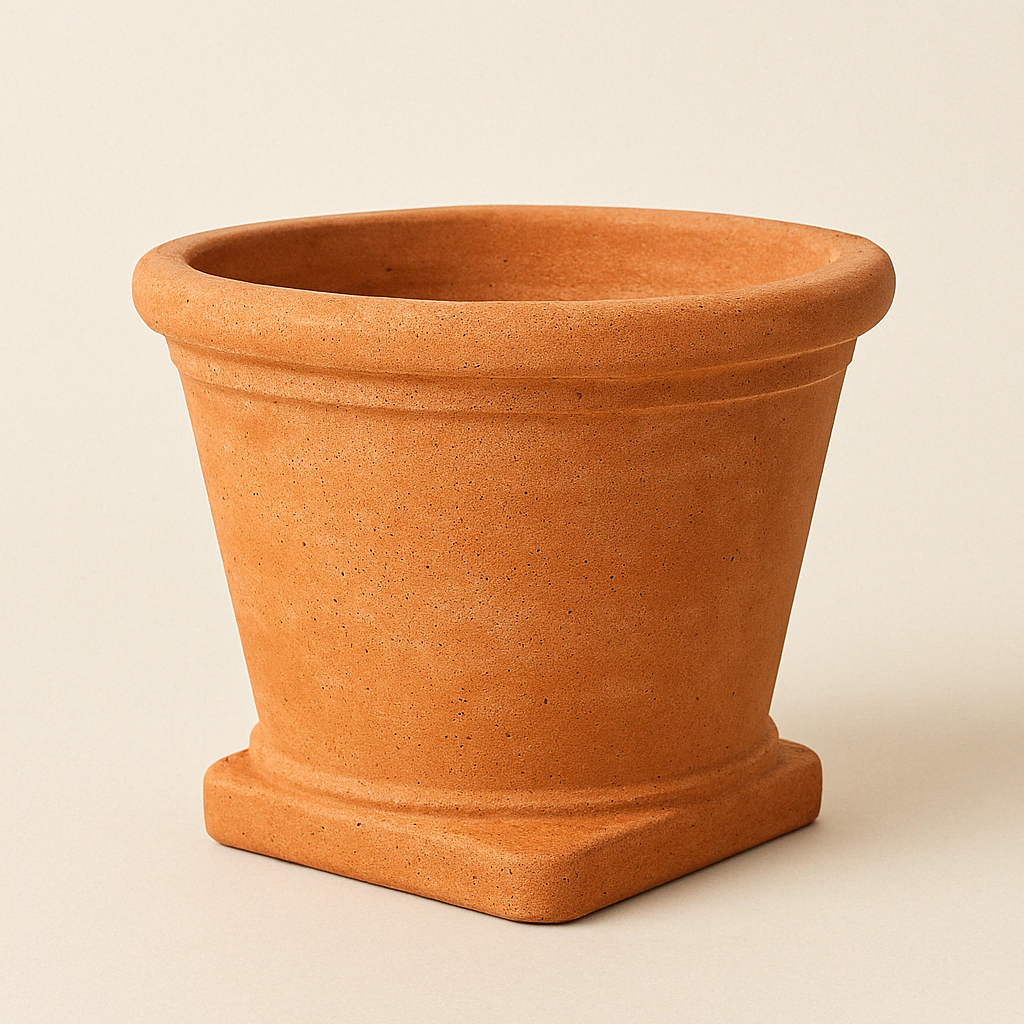 Maceta de barro de forma cuadrada con base reforzada. Una opción elegante y robusta para decorar espacios exteriores.